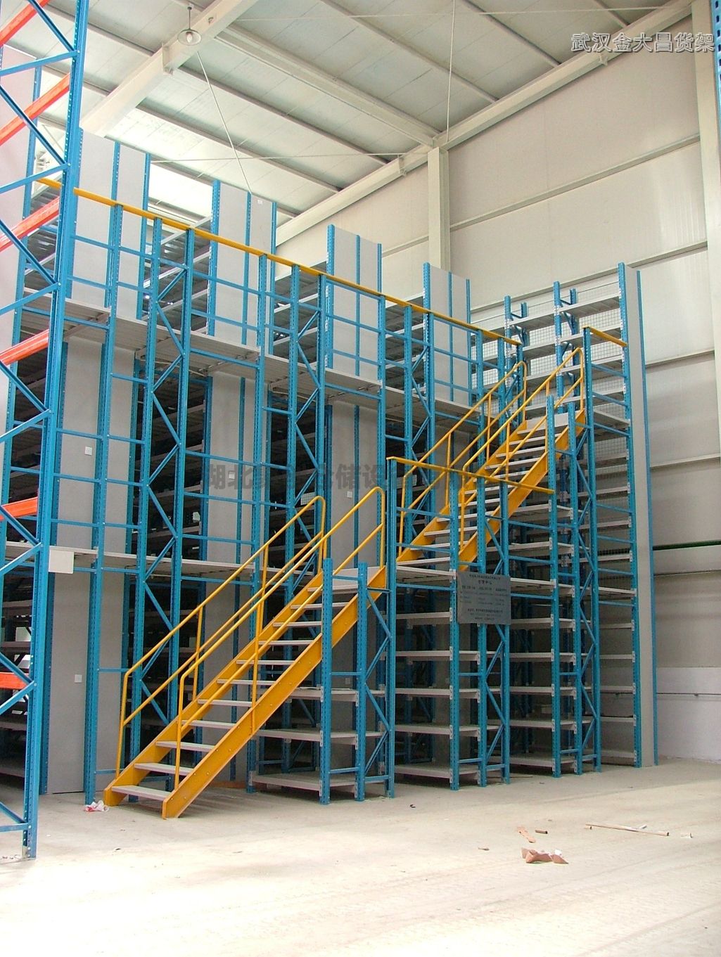 閣樓式貨架是用貨架式立柱做樓面支撐,配置一層式及多層閣樓平臺(tái),以充分增加利用存儲(chǔ)空間,可設(shè)計(jì)為多層形式(通常為2-3層)配套設(shè)置有樓梯、貨物自卸式通道,提升平臺(tái)及電梯。廣泛應(yīng)用于庫(kù)房較高、貨物小、儲(chǔ)貨較大、多種類小批量貨物存取。貨物存取通常用輕便叉車通過(guò)升降平臺(tái)或電梯把貨物送至存放樓層,再由液壓小車放至某個(gè)存放位置。此貨架形式,通常采用中量型貨架隔板式貨架或者重量型隔板式貨架作為主體(根據(jù)單元貨架總承載量決議選用何種貨架和材料配置)。一般貨架每層在500Kg左右,閣樓專用平臺(tái)為500Kg/㎡以內(nèi),樓層空間通常為2.2M-2.7M,底層貨架高度一般為2m左右,充分體現(xiàn)操作的方便性和存取貨物的靈活性、安全性。