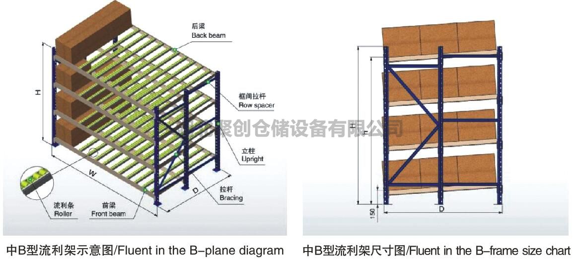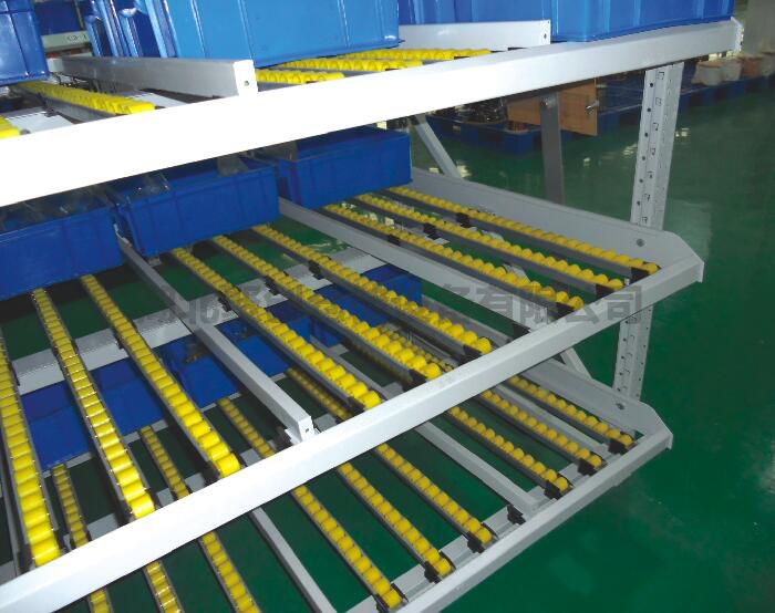 流利式貨架由立柱片、滑移層導軌、隔板等組合而成,滑移層導軌有一定傾斜度,貨物采用標準的周轉(zhuǎn)箱、紙箱存放。進料時,周轉(zhuǎn)箱通過滑移層滑入,當前面的周轉(zhuǎn)條內(nèi)的貨物取完后,將空箱取出,后面的周轉(zhuǎn)箱自動滑至取貨點,是先進先出的存儲方式。流利式貨架可用在物流中心及倉庫的揀貨區(qū),也可用于生產(chǎn)工位旁,存放制品零部件,貨物具有流動性,實現(xiàn)先進先出作物料流動管理,與普通的層板貨架相比較,不僅僅只是提供了一個儲物的空間,提高效率,是工廠生產(chǎn)線旁看板管理及物流中心揀選的最佳選擇,并且可以配合電子標簽系統(tǒng)使用。