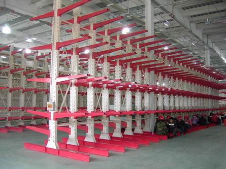 懸臂式貨架采用特制型材立柱,有單面型與雙面型,配以高強(qiáng)度受力懸臂,是存儲(chǔ)各種長(zhǎng)型物料和不規(guī)則物料的最佳方案,如型材、管材、板材等。特別適合空間不大的庫(kù)房,提高倉(cāng)庫(kù)的利用率。可用一般的叉車操作,但要求寬通道,另外亦可配天車進(jìn)行提存。懸臂式貨架主要用于存放長(zhǎng)形物料,如型材、管材、板材、線纜等,立柱多采用H型鋼材或冷軋型鋼,懸臂與立柱間采用方管、冷軋型鋼或H型鋼,懸臂與立柱間采用螺栓連接式,底座采用冷軋型鋼或H型鋼。貨物存取由叉車、天車或人工進(jìn)行。貨架高度通常在2.5米以內(nèi)(如由專用叉車存取貨則可高達(dá)6米),懸臂長(zhǎng)度在1.5以內(nèi),每臂載重通常在1000Kg以內(nèi)。此類貨架多用于機(jī)械制造行業(yè)和建材超市等。